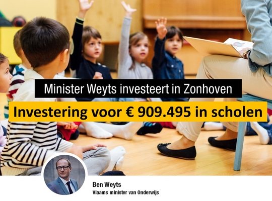 Vlaams minister van Onderwijs Ben Weyts (N-VA) investeert € 909.495 in scholen in Zonhoven. “We blijven investeren in de kwaliteit van ons onderwijs. Dus ook in de onderwijsinfrastructuur”, zegt Weyts. “Onze leerlingen en leraren horen in de beste omstandigheden onderwijs te kunnen volgen en geven.”